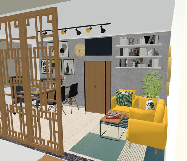 Imagens 3D de projeto de interiores de escritório pequeno com 9m2, visando o aproveitamento de espaços com ambiente multifuncional e interligado, localizado em Itapua, Salvador - BA. Projeto executado, conforme fotografias.