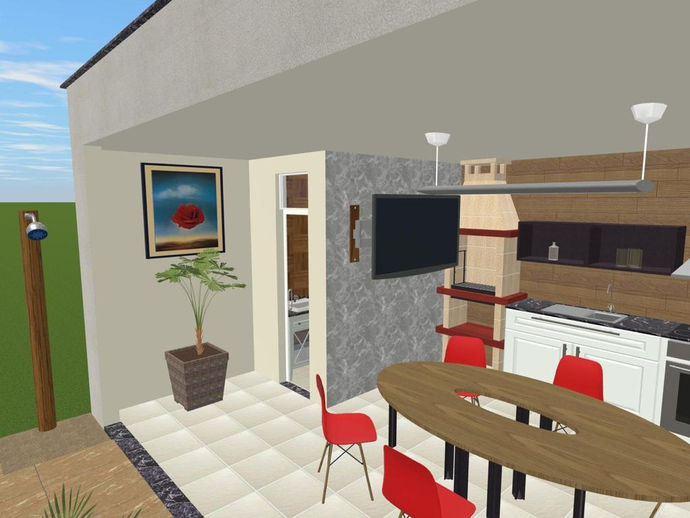 Projeto e imagens 3D de espaço gourmet personalizado de acordo com necessidade do cliente, composto por quiosque, banheiro, churrasqueira e piscina, localizado em condomínio em Buraquinho, Lauro de Freitas - BA. Obra já executada, conforme imagem.